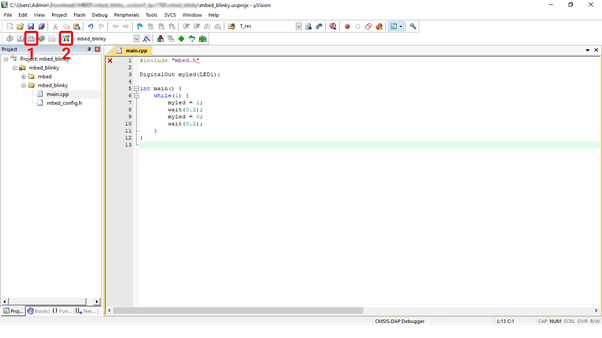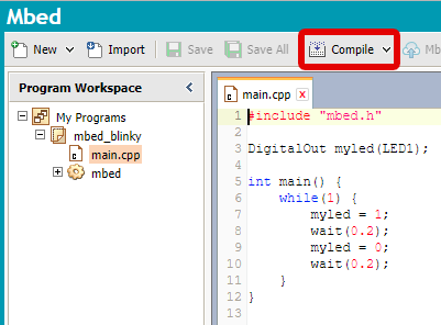 8. Click on main.cpp will open our mbed led blinking program and then click on compile button.