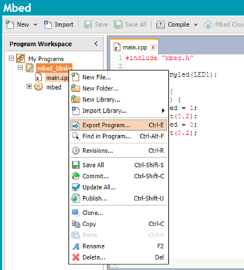 2. Open online compiler and Right click on mbed_blinky and click on Export Program.