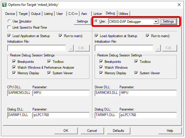 2. Open Debug menu and check CMSIS-DAP Debugger is selected or not, if not selected then select this and click on Settings button as shown in red box below.