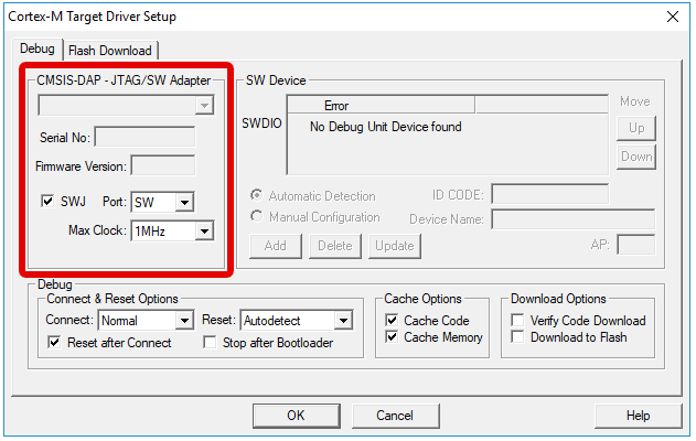 3. Click in check box of SWJ and select Port SW and Max Clock use 1MHz.
