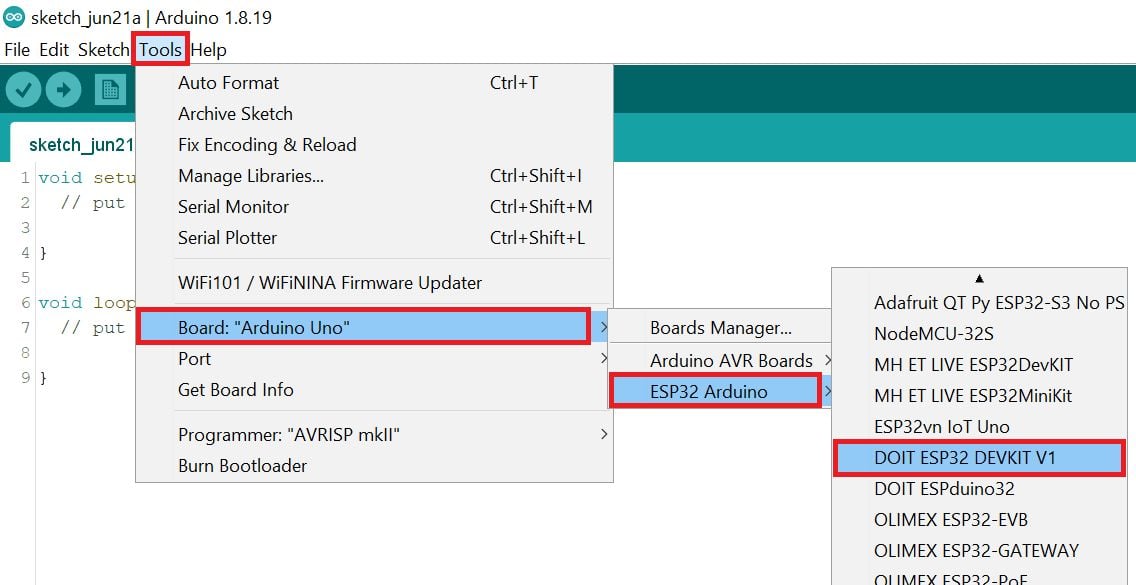 After board installation select the ESP32 board using the path Tools ► Board ► ESP32 Arduino ► DOIT ESP32 DEVKIT V1