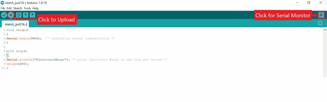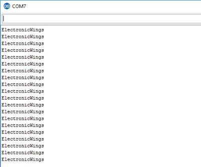 Serial.println("ElectronicWings"); /* print Electronic Wings at new line per second */