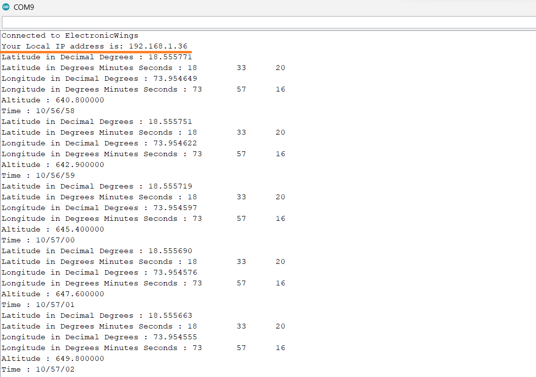 Note: If the data seen on the serial monitor is in the **** format, then relocate the GPS module connected to NodeMCU in the open space such as a balcony or terrace. After that wait for 20 to 30 sec so that the GPS module can lock on to satellites. Generally, it about 5 to 10 sec to lock the satellites if you are in a proper open space.