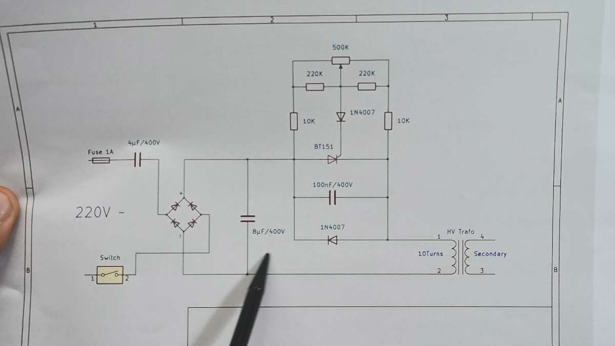 Let's explain the principle of operation. At the beginning, at the input of the circuit we have a switch and a circuit breaker. Then comes a series-connected MKP capacitor in this case with a value of 4µF. This capacitor limits the current in the circuit and if we double its value, the current will also double, but in this practical case its value should not exceed 8µF. For the sake of safety during long-term uninterrupted operation, I chose this lower value. Then comes a diode bridge- rectifier whose output is connected to a capacitor of 8µF. Next is the Triggering Stage for BT151Thyristor. A voltage divider using 220k + 220k in parallel with a 500k potentiometer is used to control the gate of the thyristor. A 10k resistor goes to each side of the SCR gate from the voltage divider output, along with a 10nF capacitor and diode protection. And the flyback (HV Trafo) is driven through 10 turns on the primary.