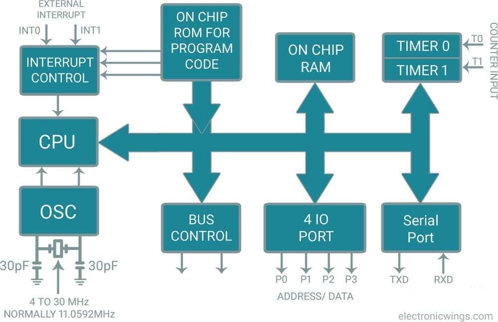 All 8051 microcontrollers have unique architecture as shown in the figure, which consists of functional blocks to build 8051 powerful controlling machines.