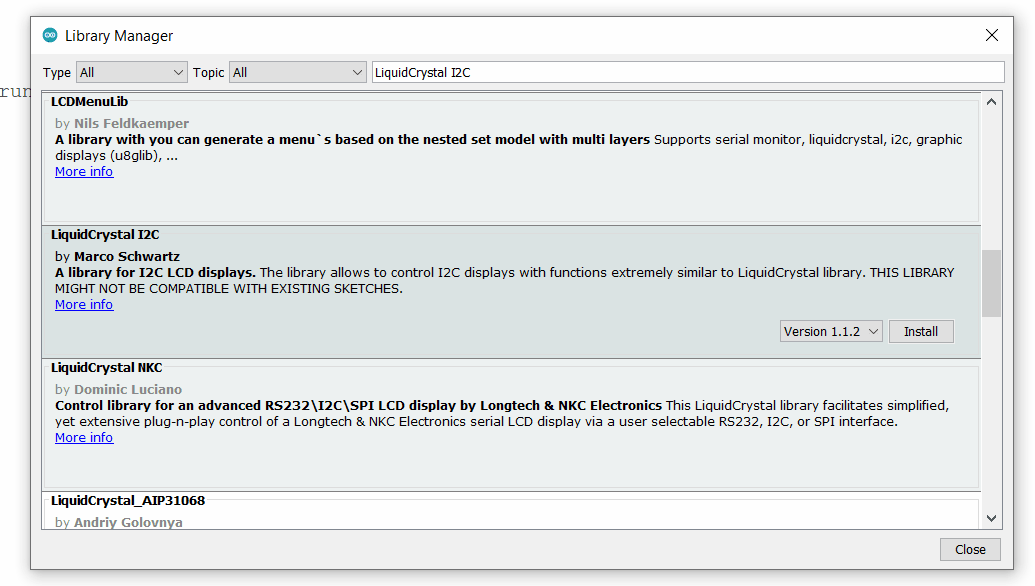 The library Manager window will pop up. Now enter LiquidCrystal I2C into the search box, and click Install on the LiquidCrystal I2C option to install version 1.1.2 or higher. As shown below image.