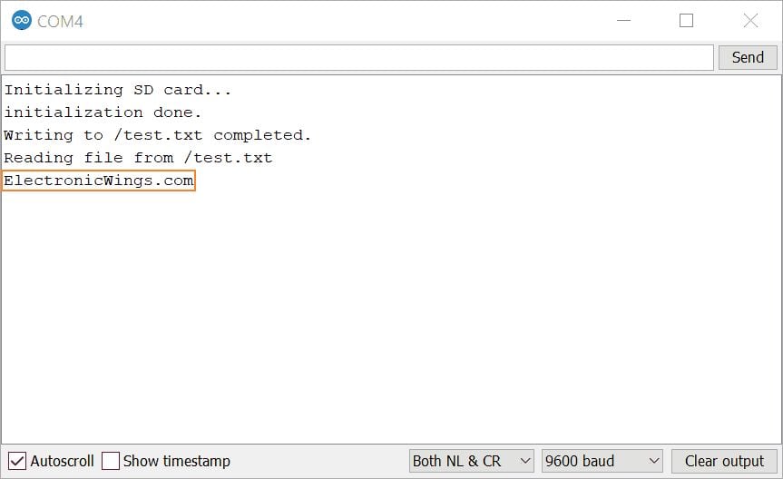 Serial.println("initialization done.");Write the ElectronicWings.com text on the /test.txt path