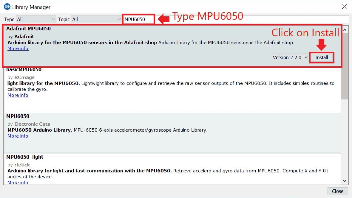 The library Manager window will pop up. Now enter MPU6050 into the search box and click Install on the Adafruit MPU6050 option to install version 2.2.0 or higher.