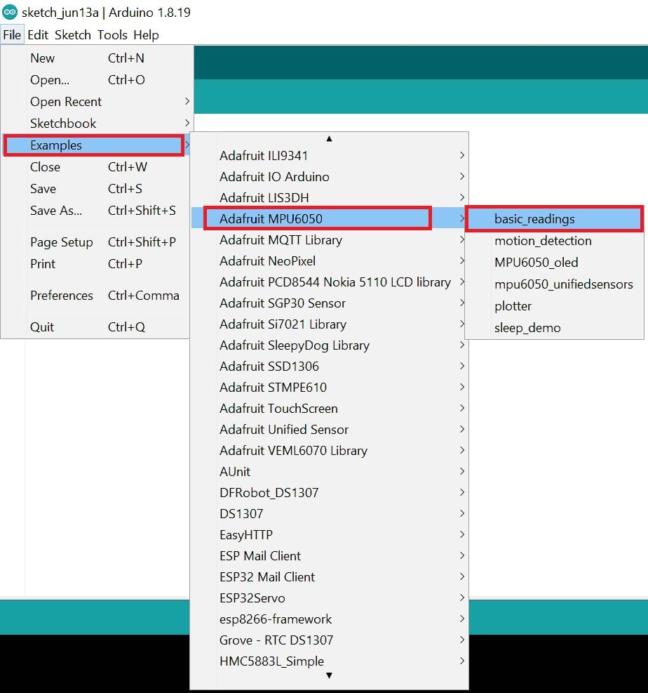 Now open the example of MFRC522. To open it navigate to File ► Examples ► Adafruit MPU6050 Library ► basic reading