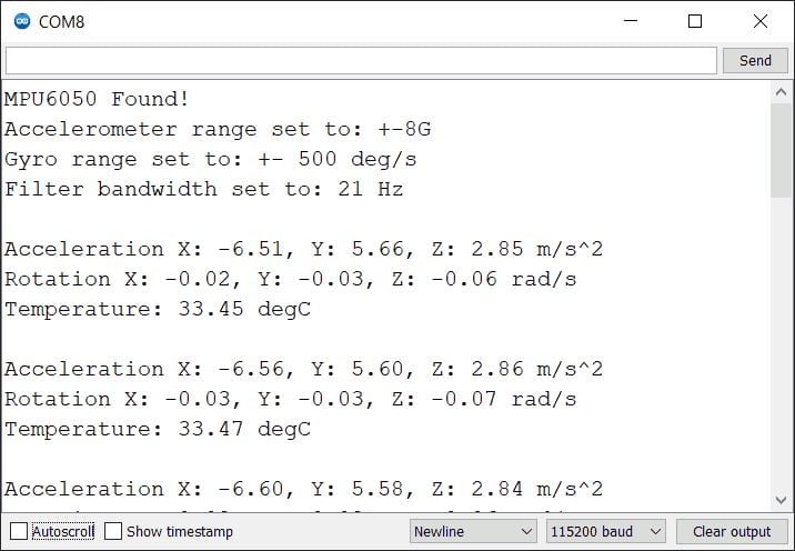 // Basic demo for accelerometer readings from Adafruit MPU6050