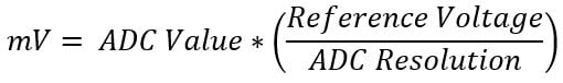 * mVolt = ADC_Count * (ADC_Referance_Voltage / ADC_Resolution)