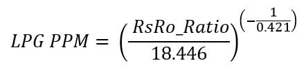 * LPG ppm = [(Rs/Ro)/18.446]^(1/-0.421)