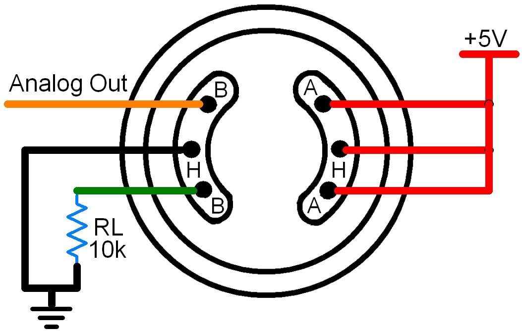 Pin B gets an analog voltage when the sensor is active. Also, across the output, you need the resistor RL.