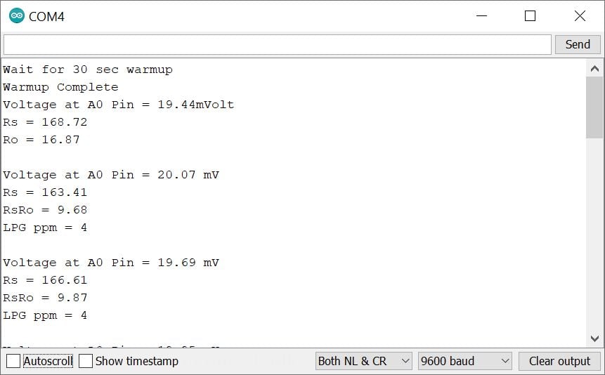 Now first read the MQ6 output voltage using Get_mVolt() function and print on the serial monitor. All other readings depend on the MQ6 Output voltage.