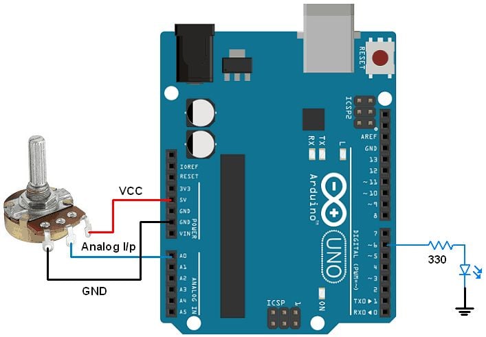 Let’s build an application in which we will control the brightness of led using Arduino by varying potentiometer knob. So, when we rotate knob of potentiometer, ADC of Arduino will read this analog signal. Then we will generate PWM signal proportional to the analog signal.