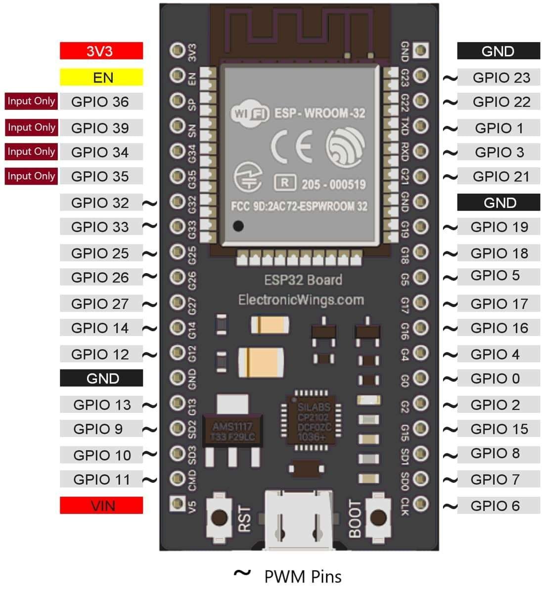 ESP32 Wroom module has 28, 0 to 16-bit PWM channels. Pins with the symbol ‘~’ represent that it has PWM support. These PWM pins are shown below image.