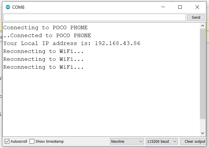 while(WiFi.waitForConnectResult() != WL_CONNECTED){Serial.print(".");}After successfully connecting to the server print the local IP address on the serial window.