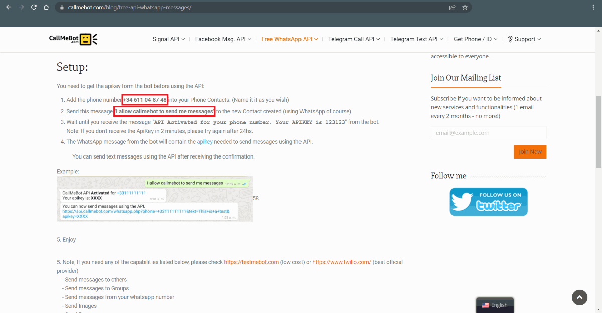 - Wait until you receive the message "API Activated for your phone number. Your APIKEY is 123123" from the bot.