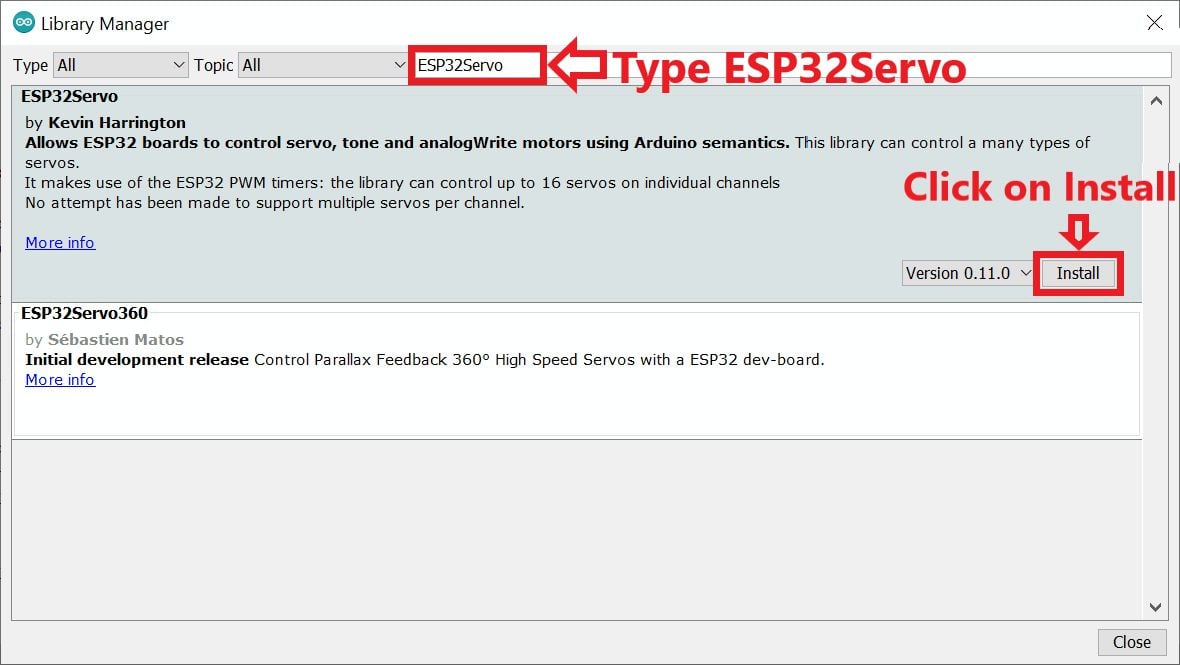 The library Manager window will pop up. Now enter ESP32Servo into the search box and click Install. (Install version 2.6.0 or higher.)