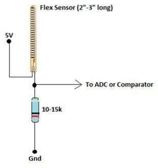 In this project, Five flex sensors are used where flex sensors are the sensors that change in resistance depending on the amount of bend on the sensor since the resistance is directly proportional to the amount of bending and they convert the change in bend to electrical resistance, more the change more the value of resistance. So, it is often called a Flexible Potentiometer. The amount of resistance is changing when flex sensor is bending. Flex sensor acts as variable resistance R1 along with the static resistance R2 and works on the principle of Voltage divider. The variable output voltage V0 is calculated as