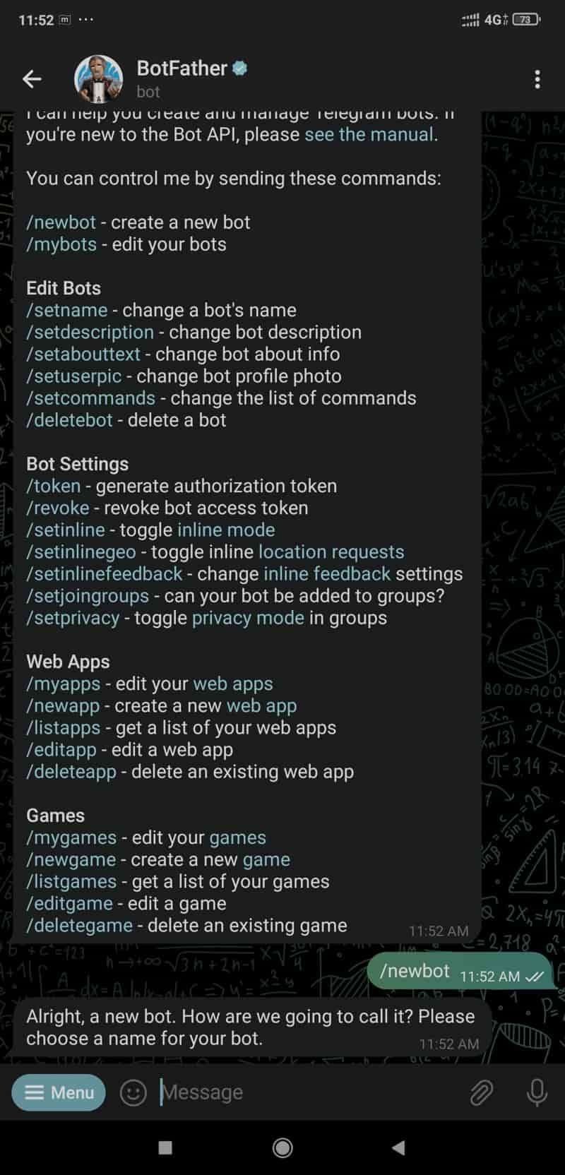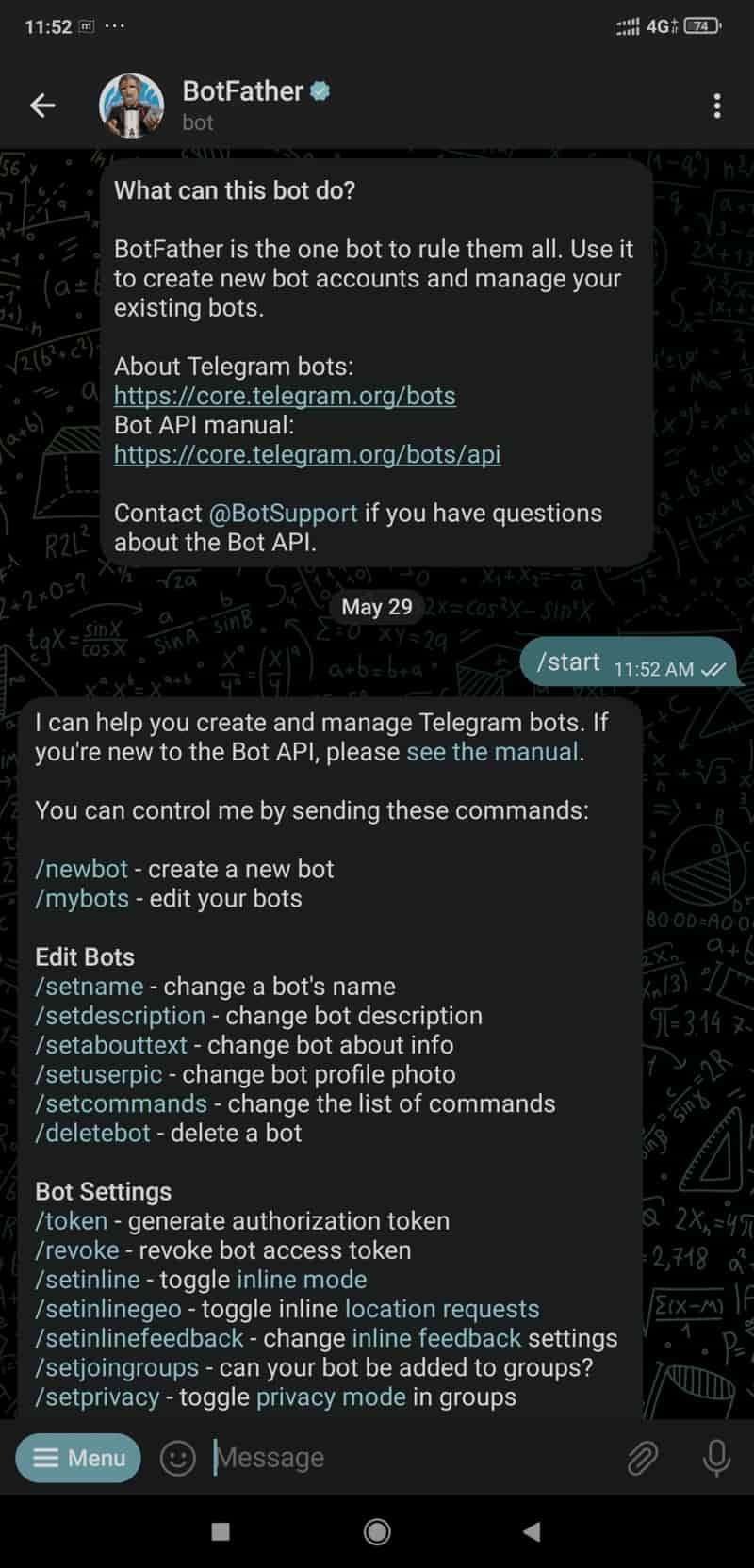 - So we will take the help of BotFather which is a Bot available on Telegram that manages all the bots that you create via your account on Telegram to send or receive the from your program or scripts.