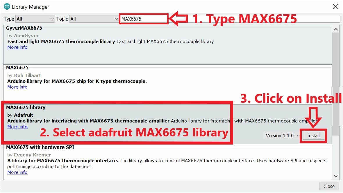 - The library Manager window will pop up. Now enter MAX6675 into the search box, and click Install on the MAX6675 library by Adafruit option to install version 1.1.0 or higher.