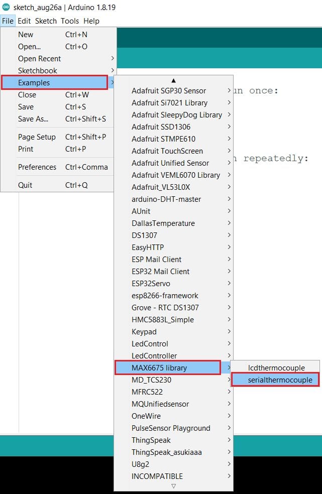 Go to File ► Example ► MAX6675 library ► serialthermocouple