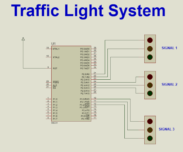 In this circuit ,I have used three traffic light. signal 1(P2.0 to P2.2) and signal 2 (P2.3 to P2.5) are connected to port 2 and signal 3(P3.0 to P3.2) is connected to port 3.Traffic light gets turned on as per the sequence provided in the program.