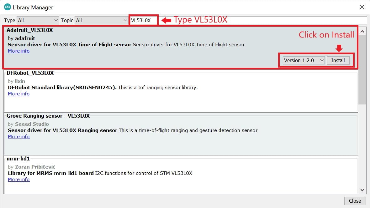 Here we are using Adafruit libraries for the above example. We will need to install the Adafruit VL53L0X library using the Arduino Library Manager.
