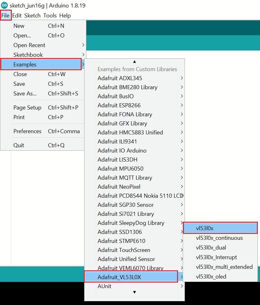Now open example of vl53l0x. To open it navigate to File ► Examples ► Adafruit_VL53L0X ► vl53l0x